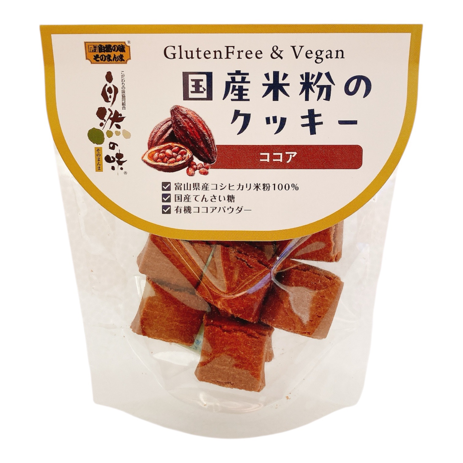 | 原材料 | 米粉(米(富山県産))、有機パーム油、甜菜糖、有機豆乳(大豆を含む)、アーモンドプードル、有機ココア、食塩 |