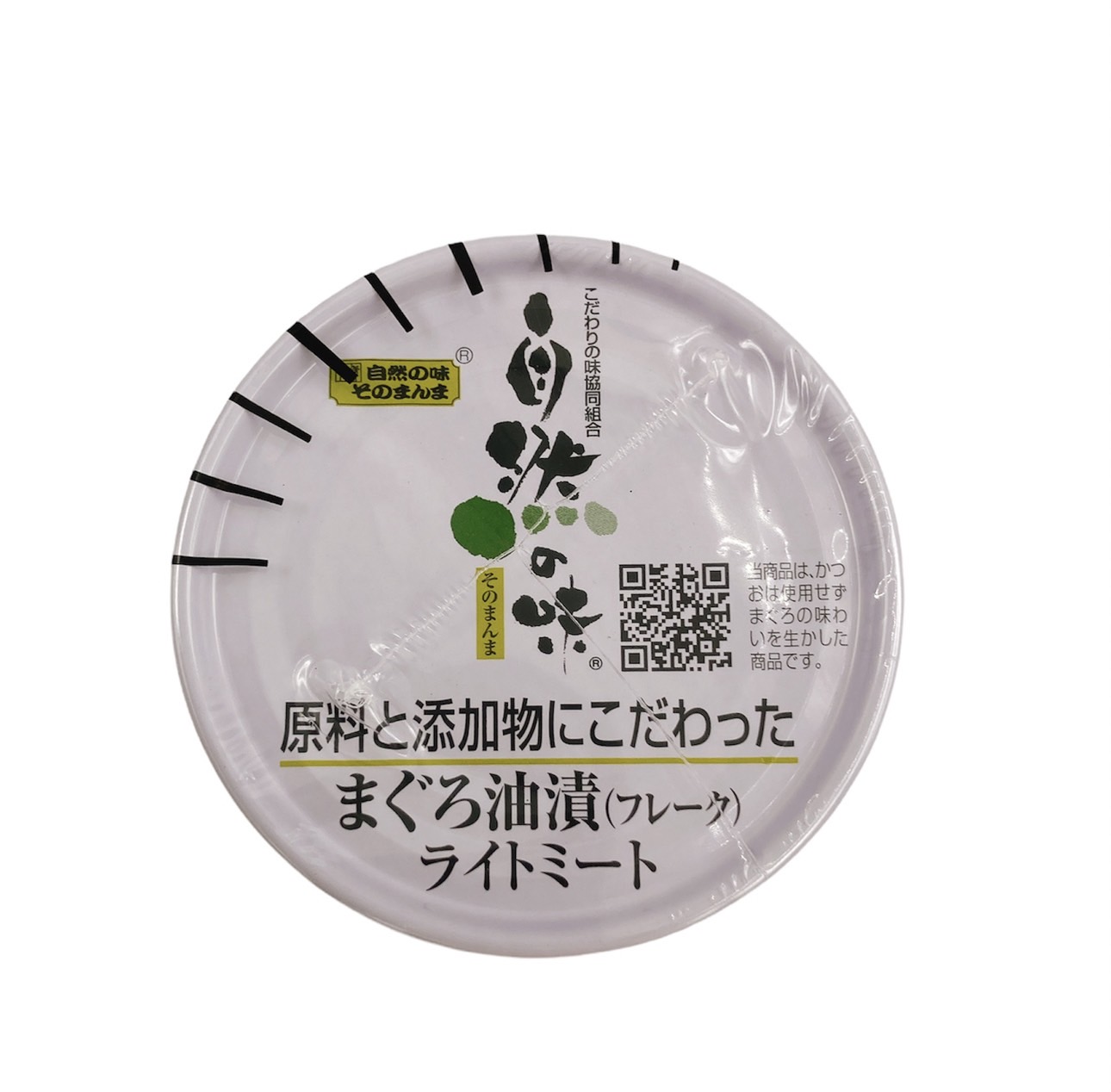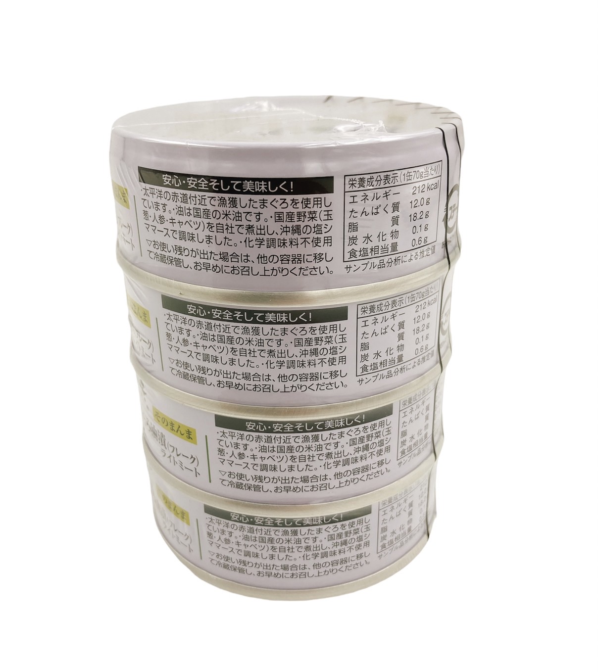 うま味調味料は使用せず、まぐろの味わいを生かすため、国産のきゃべつ・たまねぎ・にんじんを一度乾燥させたのちに煮出した野菜スープと「沖縄の塩シママース」(輸入天日塩を沖縄県の海水で溶解し、平釜で炊き上げて再結晶させた食塩です)で調理し、国産の米油を入れ巻き締め、加圧加熱殺菌したまぐろ油漬フレークです。