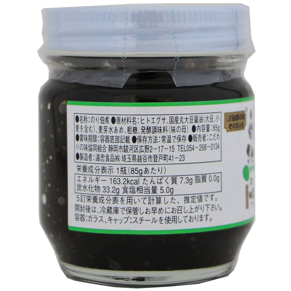 | 原材料 | ヒトエグサ、国産丸大豆醤油(大豆、小麦を含む)、麦芽水あめ、粗糖、醗酵調味料(味の母) |