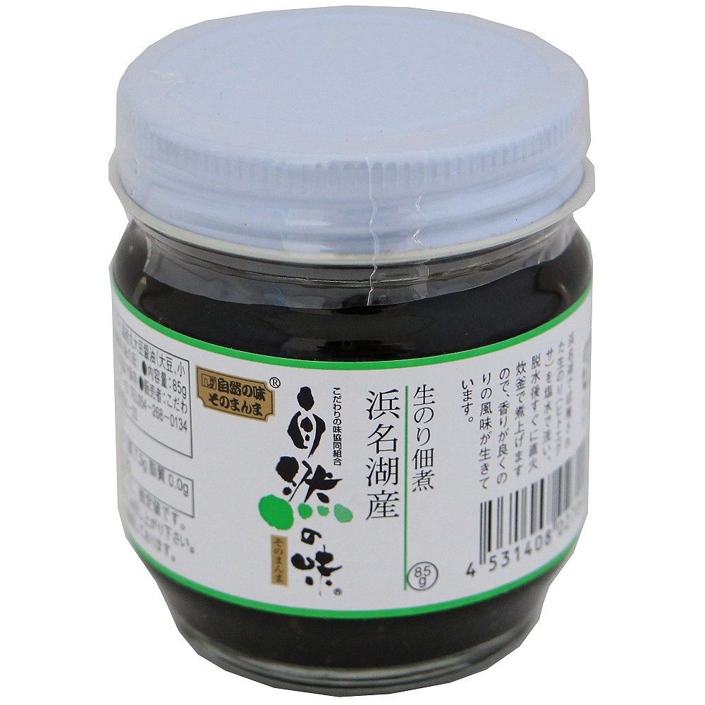 浜名湖で収穫された生のりを使用した生のり佃煮!また、風味が抜けないよう塩水で洗浄し、昔ながらの直火釜でじっくり煮上げているので、海苔の風味が生きた佃煮です。調味料は、国産丸大豆を使用して、約1年熟成させた醤油を中心に、最小限の調味料で味付けしています。