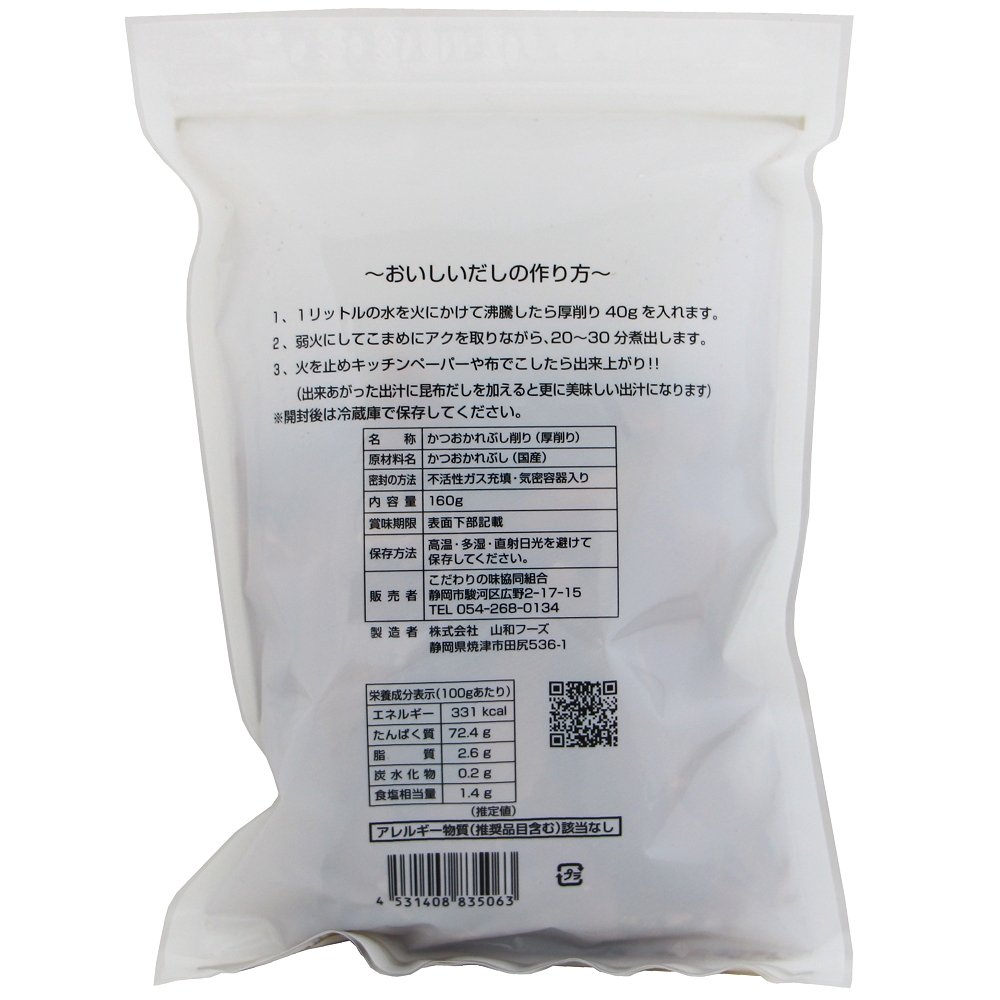 静岡県の焼津港で水揚げされた鰹を焼津で鰹節にした鰹節厚削りです!カビ付け3回の枯本節です。まろやかで本格的で上品なだしがとれます。