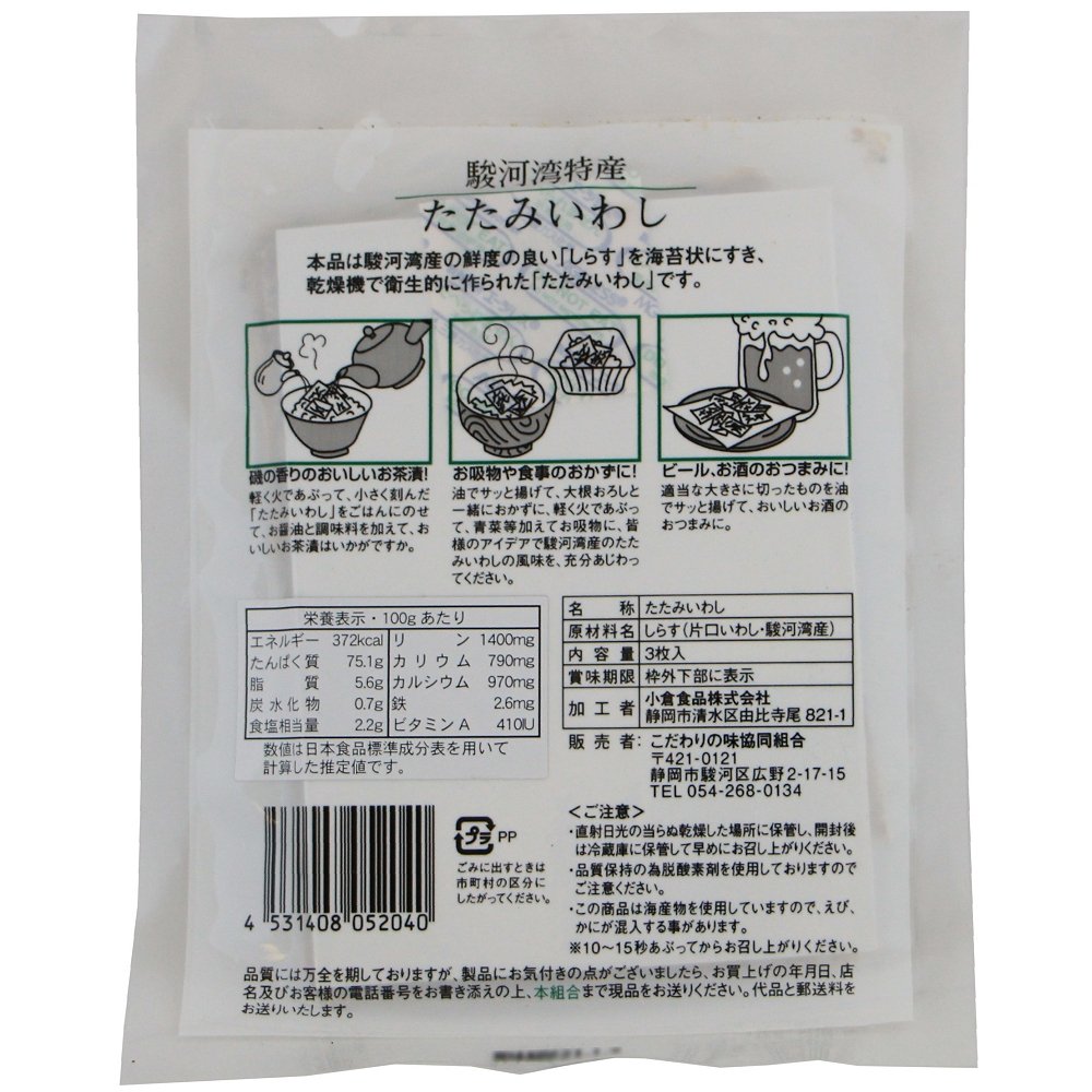 駿河湾産しらす100%の無添加たたみいわし!静岡県の名産品として知られるたたみいわしは用宗港(もちむね:静岡市駿河区)で水揚げされたばかりの新鮮な駿河湾産しらすをそのまま海苔状に乾燥させた一品です。鮮度や風味を損なわないように無添加で手早く仕上げました。上品な味わいでちょっと炙ればとても美味しくカルシウムがいっぱい摂れます。