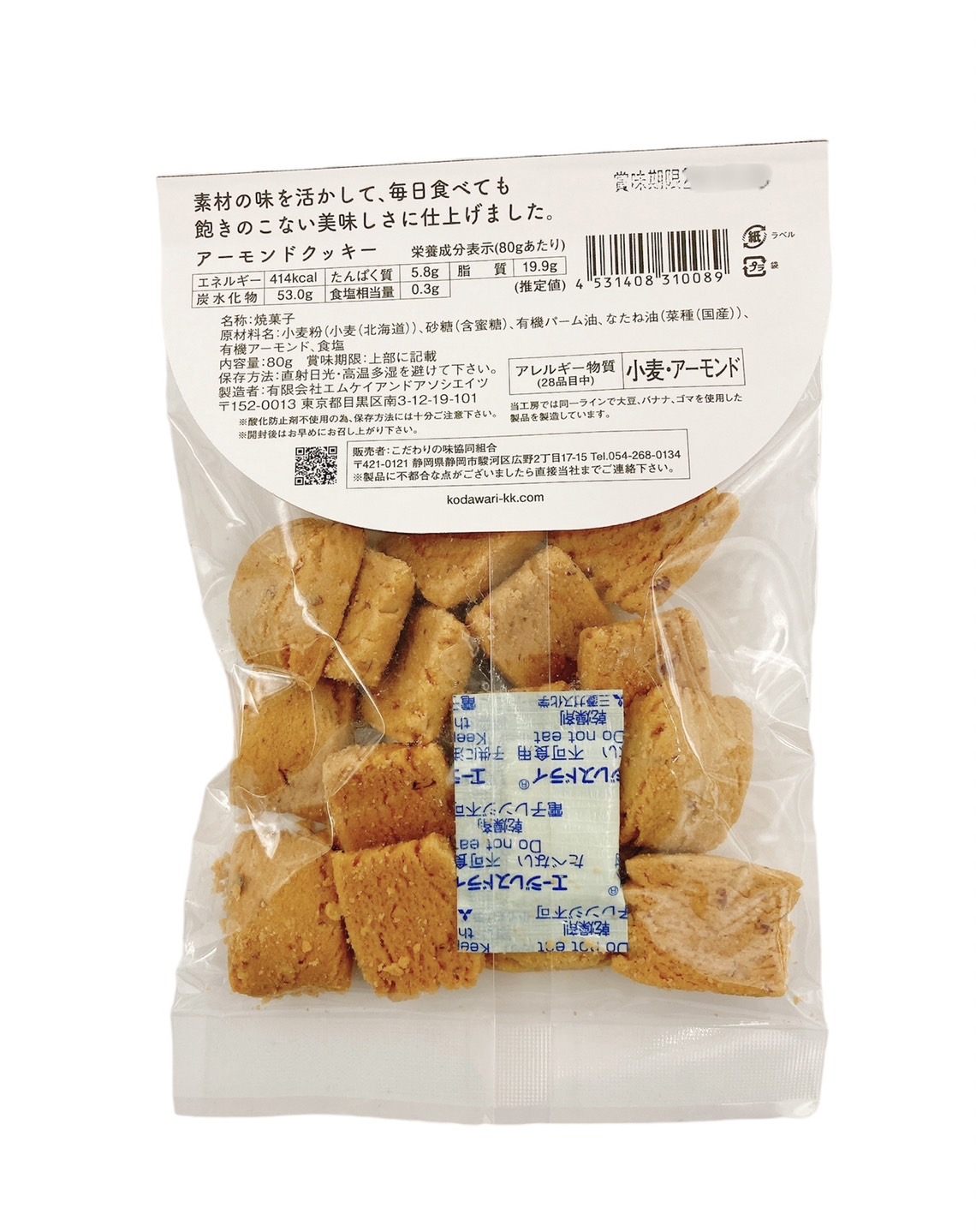 | 原材料 | 小麦粉(小麦(北海道))、砂糖(含蜜糖)、有機パーム油、なたね油(菜種(国産))、有機アーモンド、食塩(沖縄) |