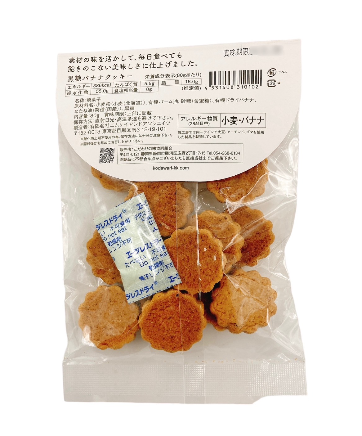 | 原材料 | 小麦粉(小麦(北海道))、有機パーム油、砂糖(含蜜糖)、有機ドライバナナ、なたね油(菜種(国産))、黒糖(沖縄) |