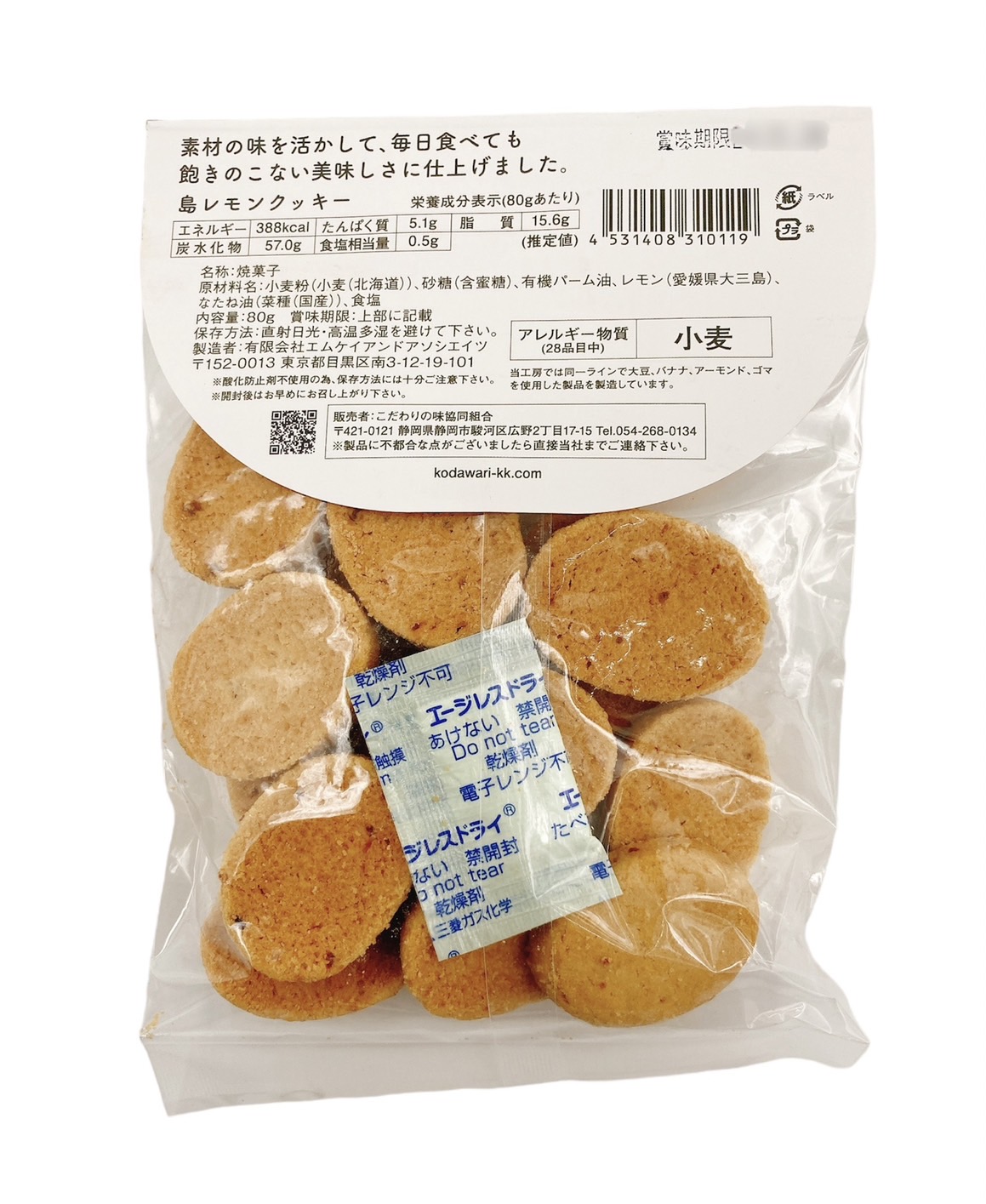 | 原材料 | 小麦粉(小麦(北海道))、砂糖(含蜜糖)有機パーム油、レモン(愛媛県大三島)、なたね油(菜種(国産))、食塩(沖縄) |
