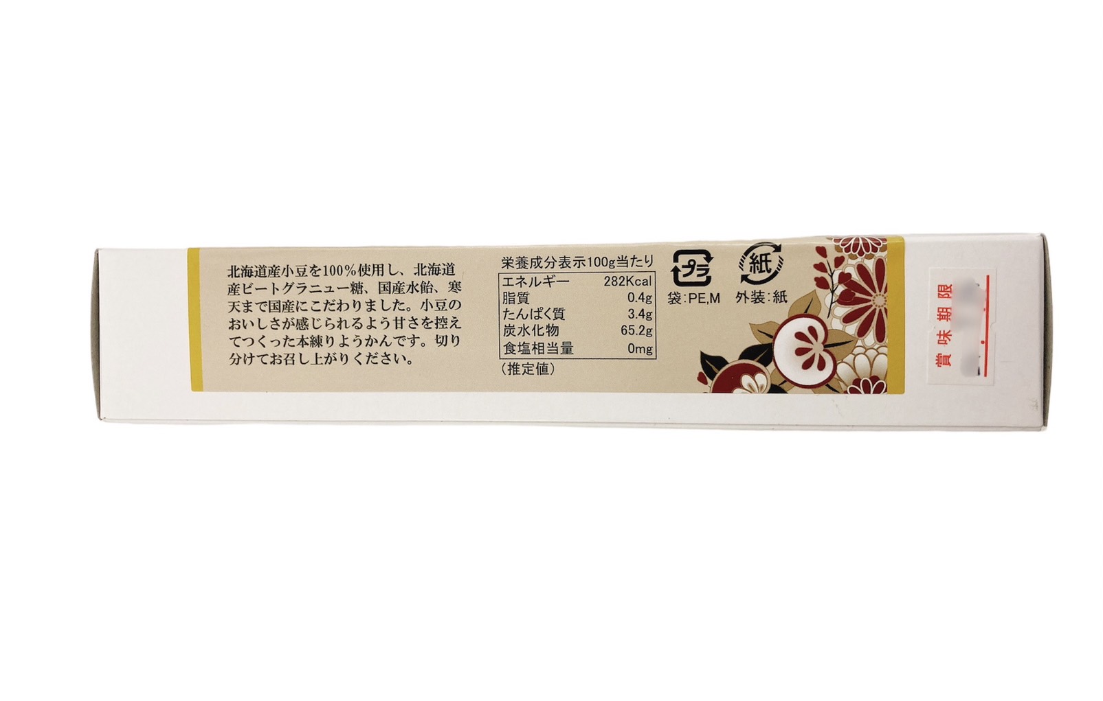 | 原材料 | 砂糖(北海道産ビートグラニュー糖)、生餡(北海道産特別栽培小豆)、水飴(国産さつま芋)、寒天(国産天草) |