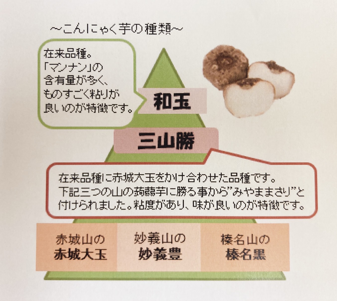 ◎原料は日本古来から伝わる和玉(在来種蒟蒻芋・広島県産)の生芋と、みやままさりの蒟蒻粉(群馬県産)のみを使用しました。