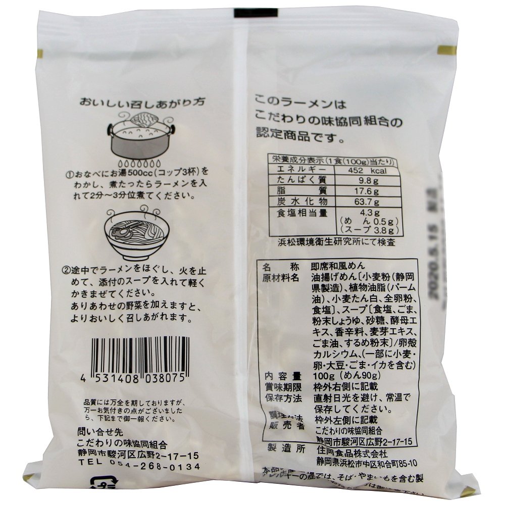 静岡県産小麦(キヌアカリ)を100%使用したラーメンです。「かんすい」は使わず、卵殻カルシウムや全卵粉で食感を出しました。めんの揚油は100%植物油(パーム油)を使用しています。パーム油にBHAは使用していません。おなべにお湯500ccをわかし、煮たったらラーメンを入れて2~3分位煮てください。ありあわせの野菜を加えますとよりおいしく召しあがれます。