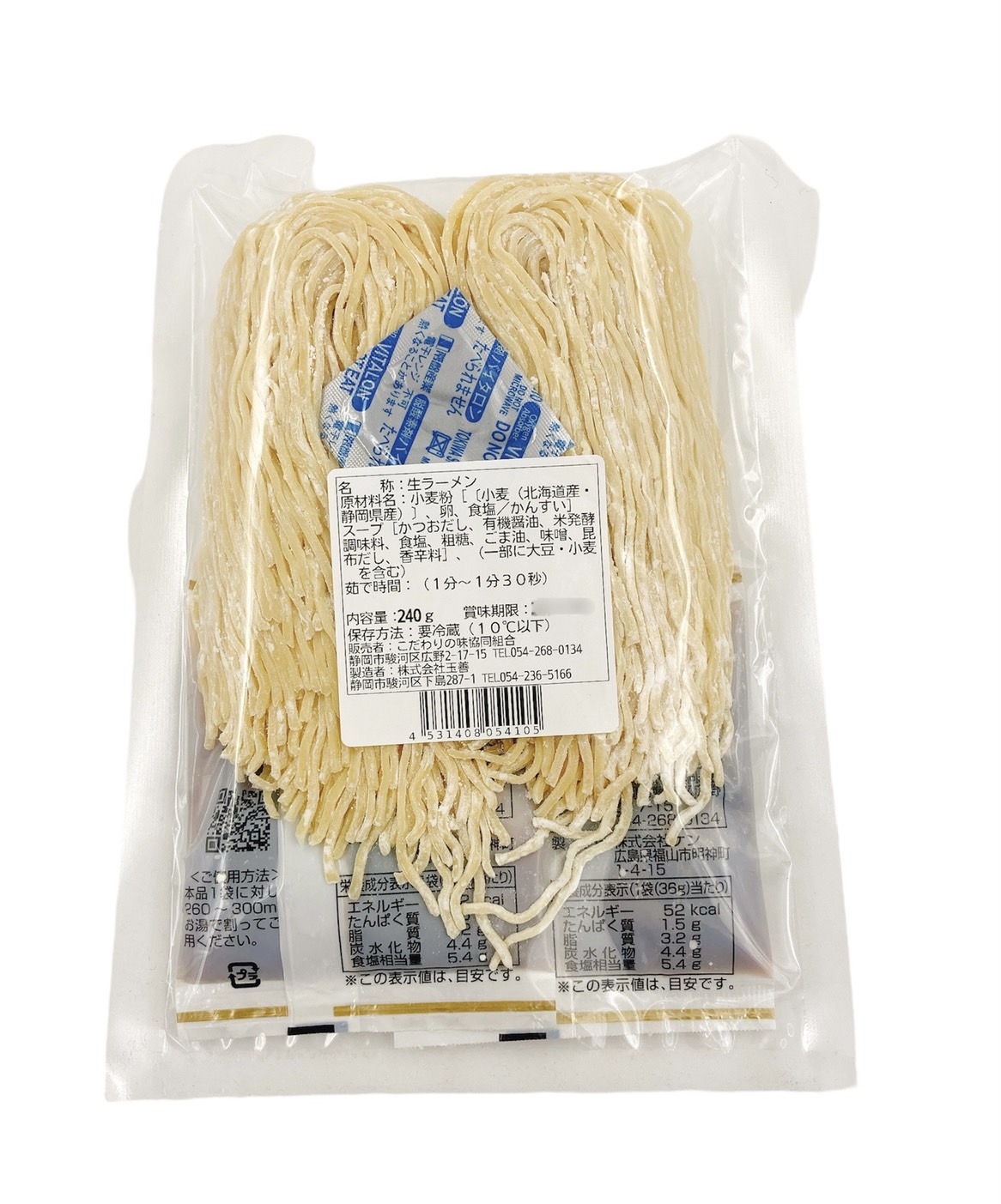 | 原材料 | めん:小麦粉[〔小麦(北海道産・静岡県産)〕、卵、食塩/かんすい] スープ[かつおだし、有機醤油、米発酵調味料、食塩、粗糖、ごま油、味噌、昆布だし、香辛料](一部に大豆・小麦を含む) |