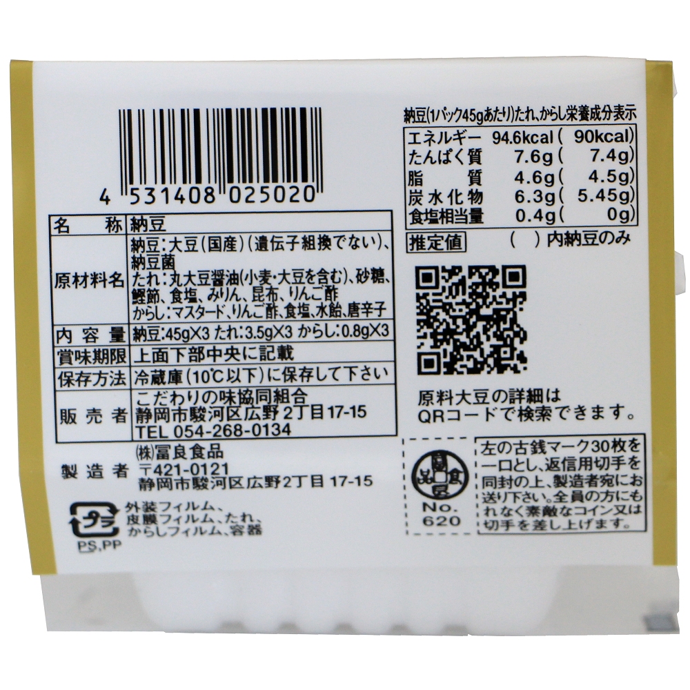 | 内容量 | 国産大豆、納豆菌(遺伝子組み換え大豆は使用しておりません) |