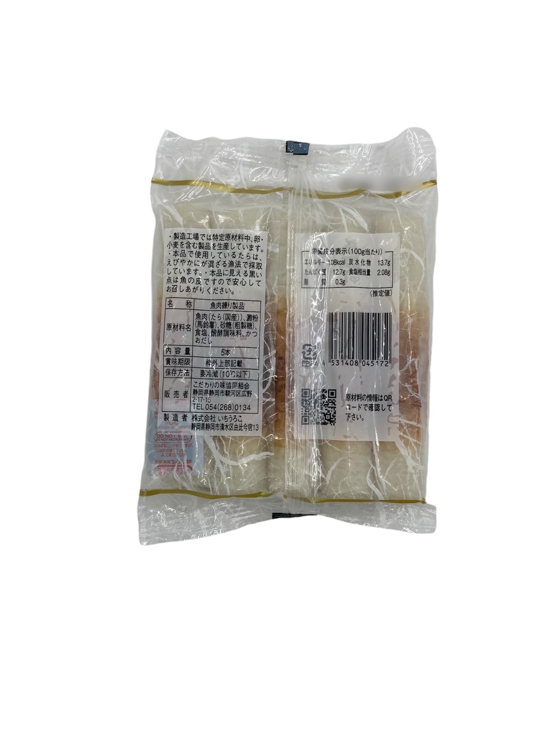 | 原材料 | 魚肉(たら(国産))澱粉(馬鈴薯)、砂糖(粗製糖)、食塩、発酵調味料、かつおだし |