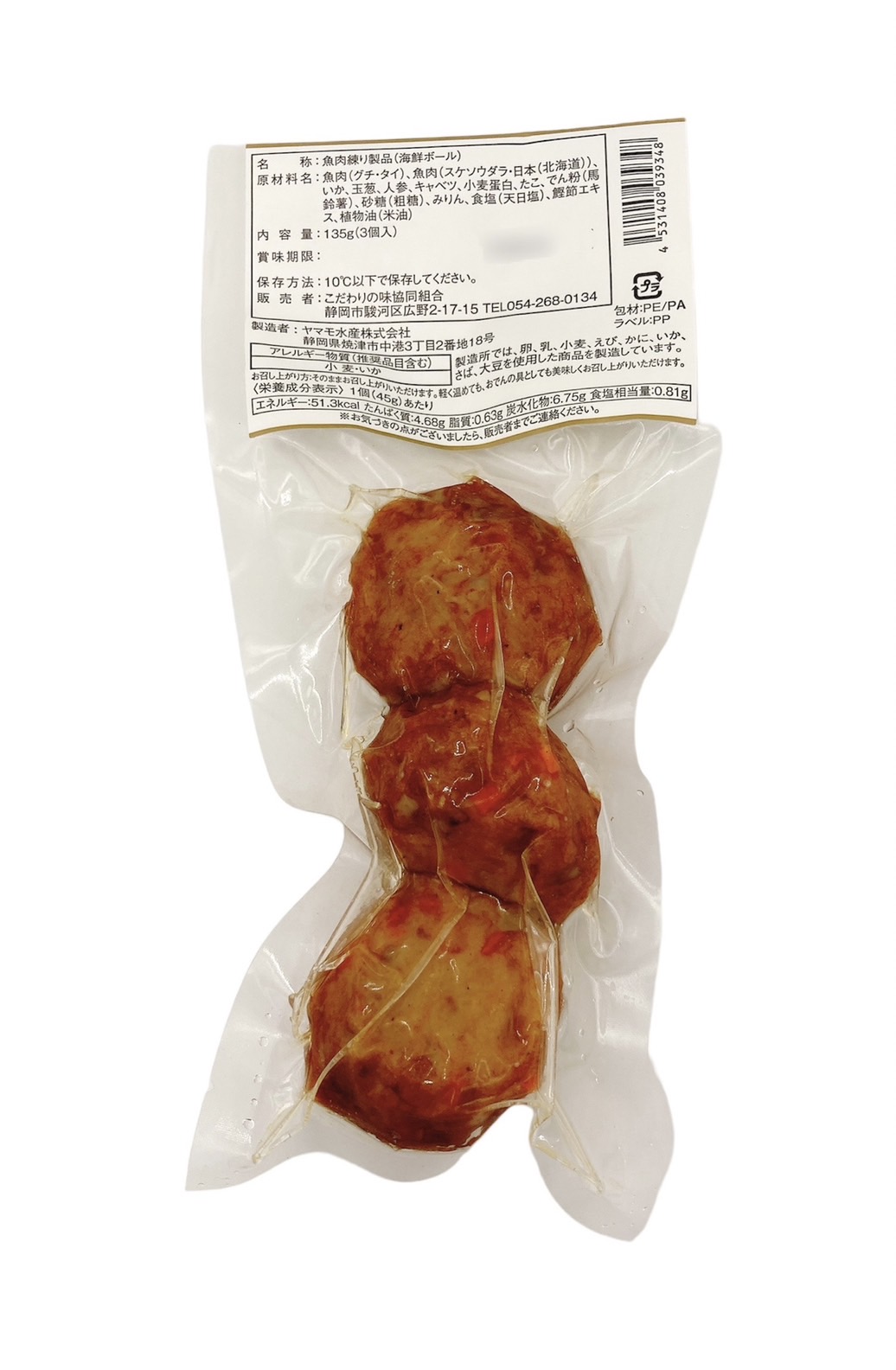 | 原材料 | 魚肉(グチ・タイ)、魚肉(スケソウダラ・日本(北海道))、いか、玉葱、人参、キャベツ、小麦蛋白、たこ、でん粉(馬鈴薯)、砂糖(粗糖)、みりん、食塩(天日塩)、鰹節エキス、植物油(米油) |