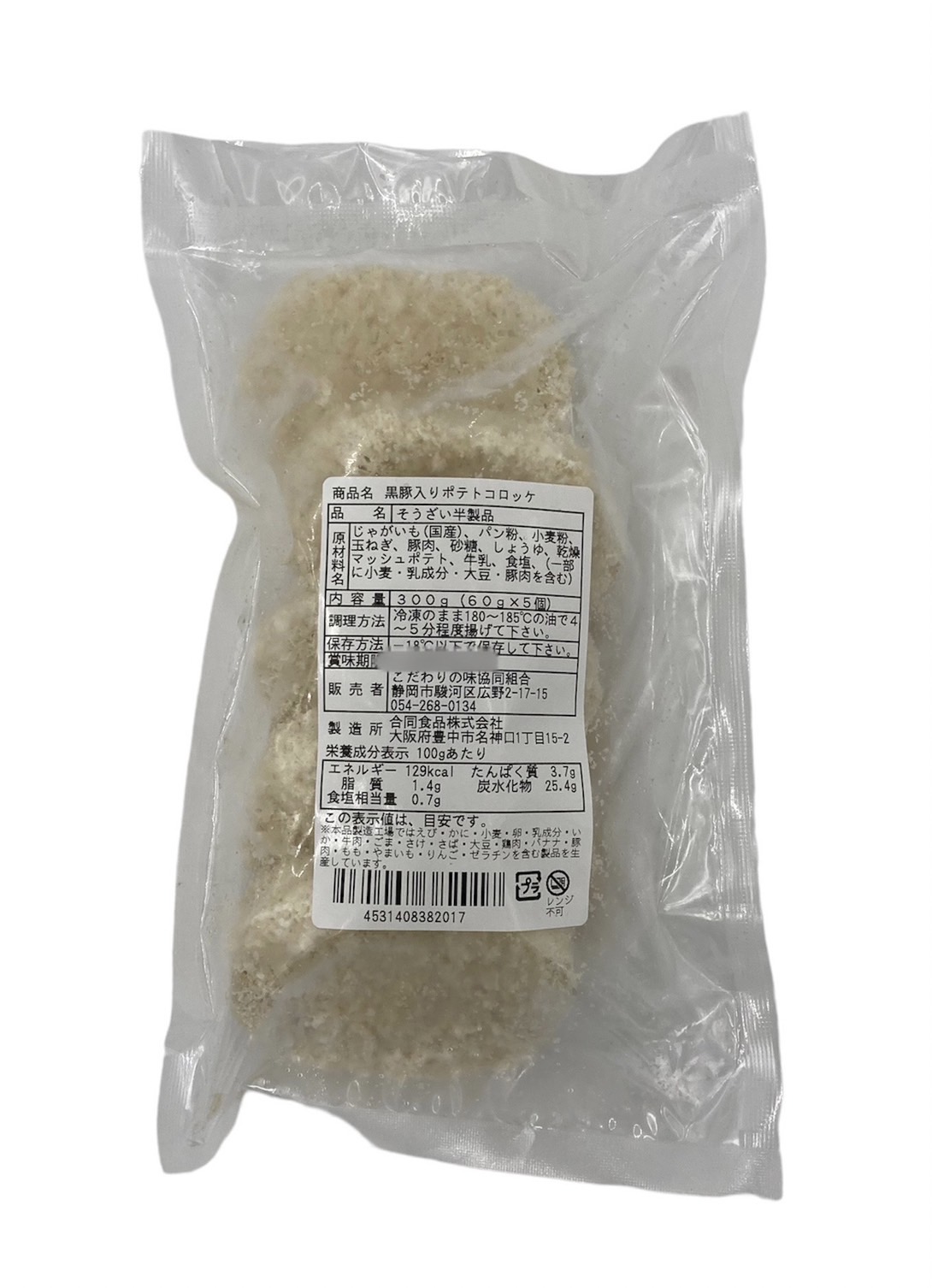 原材料 じゃがいも(国産)、パン粉、小麦粉、玉ねぎ、豚肉、砂糖、しょうゆ、乾燥マッシュポテト、牛乳、食塩、(一部に小麦・乳成分・大豆・豚肉を含む)
