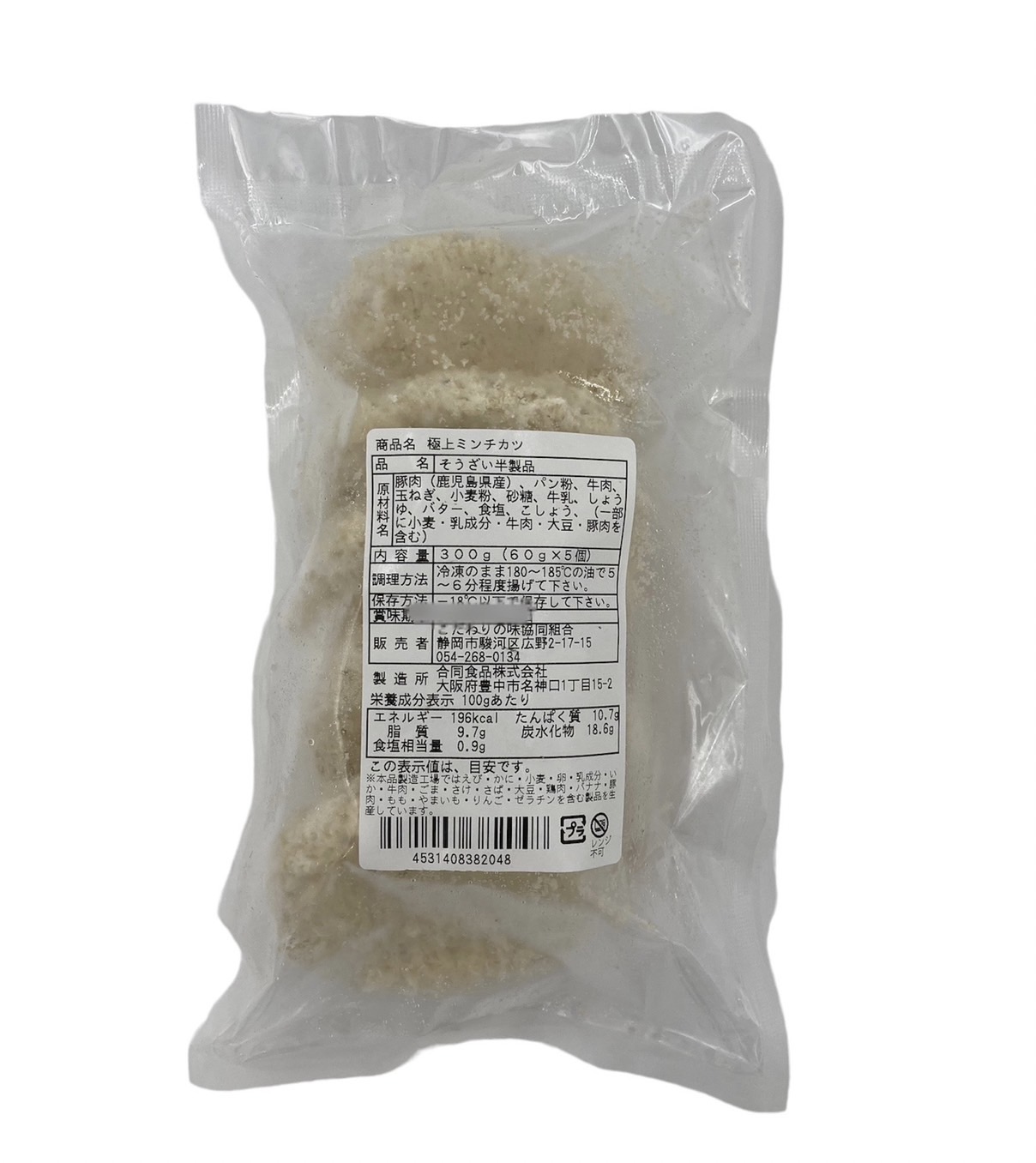 | 原材料 | 豚肉(鹿児島県産)、パン粉、牛肉、玉ねぎ、小麦粉、砂糖、牛乳、しょうゆ、バター、食塩、こしょう、(一部に小麦・乳成分・牛肉・大豆・豚肉を含む) |