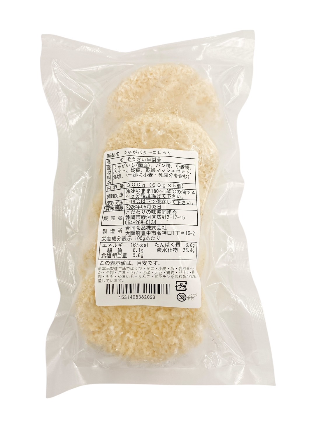 | 原材料 | じゃがいも(国産)、パン粉、小麦粉、バター、砂糖、乾燥マッシュポテト、食塩、(一部に小麦・乳成分を含む) |