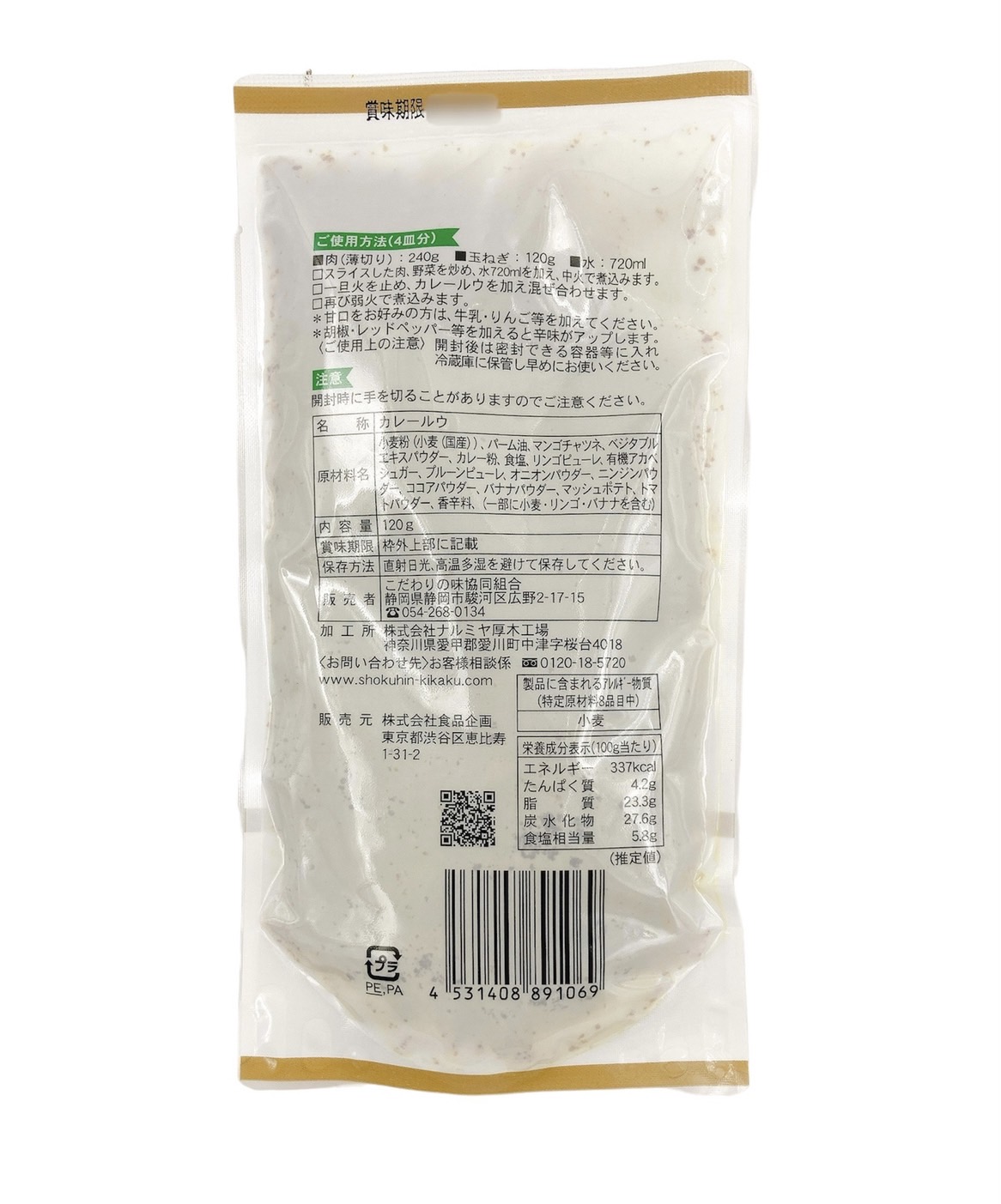 | 原材料 | 小麦粉(小麦(国産))、パーム油、マンゴチャツネ、べジタブルエキスバウダー、カレー粉、食塩、リンゴピューレ、有機アカベシュガー、プルーンピューレ、オニオンパウダー、ニンジンパウダー、ココアパウダー、バナナパウダー、マッシュポテト、トマトパウダー、香辛料、(一部に小麦・リンゴ・バナナを含む) |