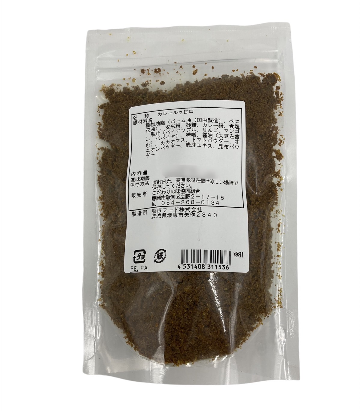 | 原材料 | 植物油脂(パーム油(国内製造)、べに花油)、玄米粉、砂糖、カレー粉、食塩、果汁(パイナップル、りんご、マンゴー、パパイヤ)、味噌、醤油(大豆を含む)、カカオマス、トマトパウダー、オニオンパウダー、麦芽エキス、昆布パウダー |