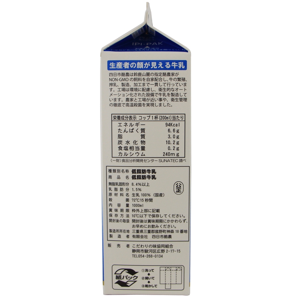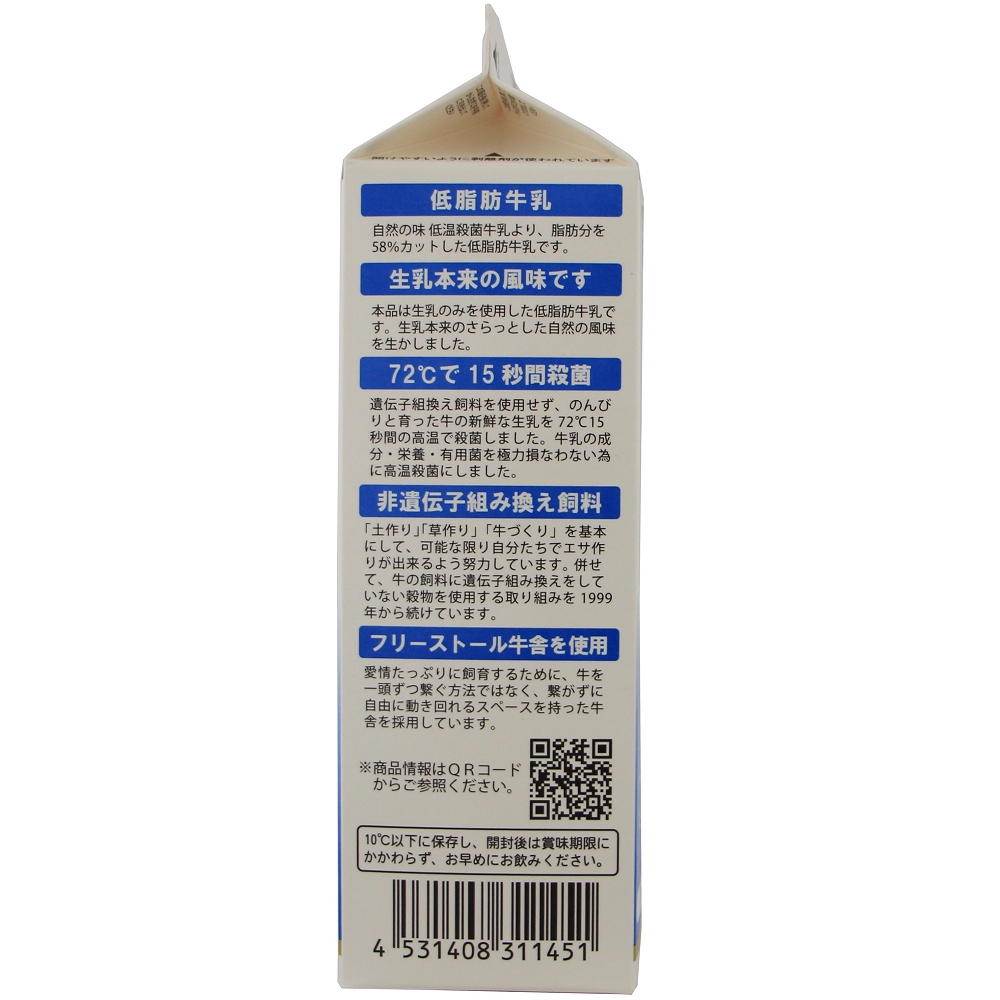 美味しく、安心して牛乳が飲みたいけど、脂肪分が気になる方にお勧めの、脂肪分を58%カットした低脂肪牛乳です。原材料は遺伝子組換え分別生産流通管理済みの飼料で、飼育された乳牛の生乳を100%使用。乳飲料とは全く異なります。乳脂肪分を1.5%にした低脂肪乳です。(温度帯72℃15秒間/高温殺菌)生乳は低温殺菌牛乳に利用できる、衛生面の徹底された新鮮な生乳を使用しています。コクとミルク感を味わっていただける商品です。